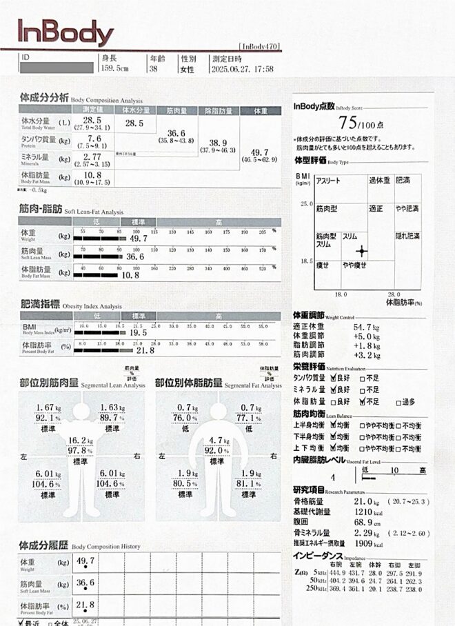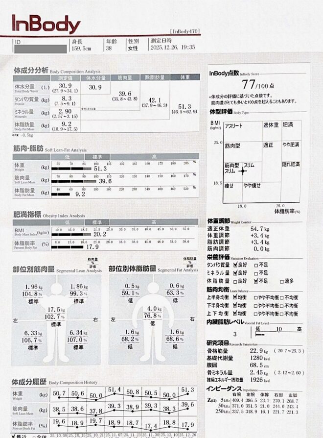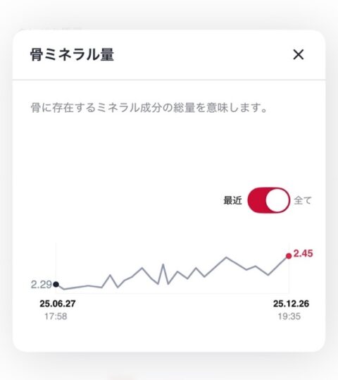 地味なことだけど骨ミネラル量が着実に増えているのも、骨粗鬆症リスクに備えなければならない中年女性としては嬉しい気づき。運動の刺激が骨に必要なんだと実感する。